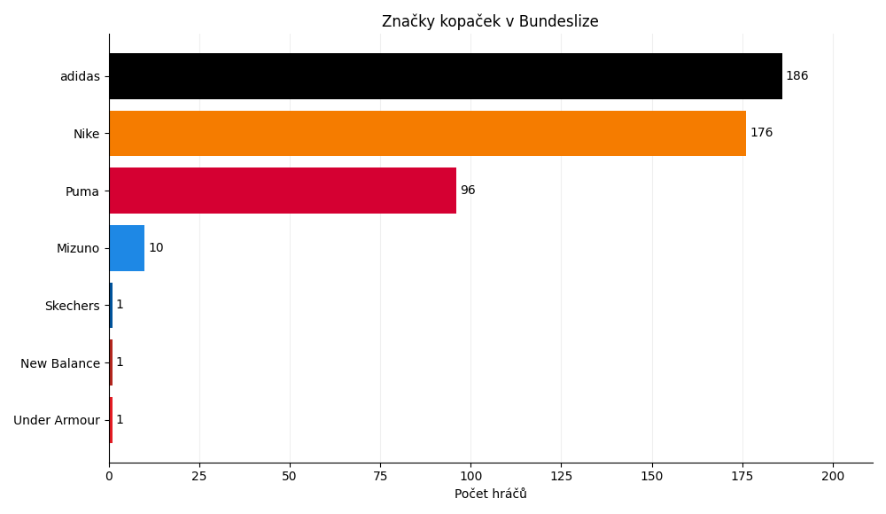 Německo je domácí hřiště značek adidas a Puma, které tady mají sídla. Přestože je adidas na první příčce (39,5%), na paty jí mocně šlape Nike (37,4%). Puma (20,4%) opět lehce zaostává. I v Bundeslize má svoji stopu značka Mizuno (2,1%).