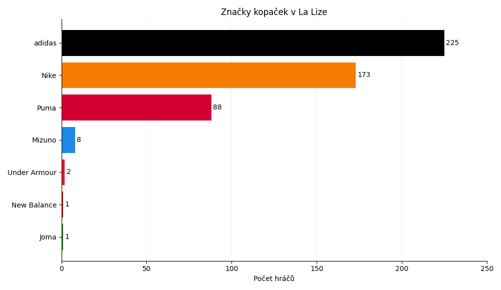 Ve španělské La Lize si skoro celou půlku koláče ukosla adidas (45,2%) a velkou část zbytku pak Nike (34,7%) a Puma (17,7%). Za zmínku stojí i Mizuno (1,6%).