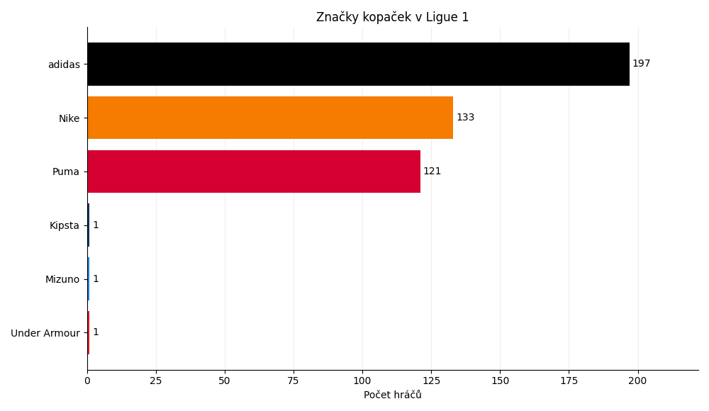 Francouzská prvoligová hřiště si rozdělila svatá trojice adidas (43,4%), Nike (29,3%) a Puma (26,7%). Všechny tři značky tady doslova dominují.