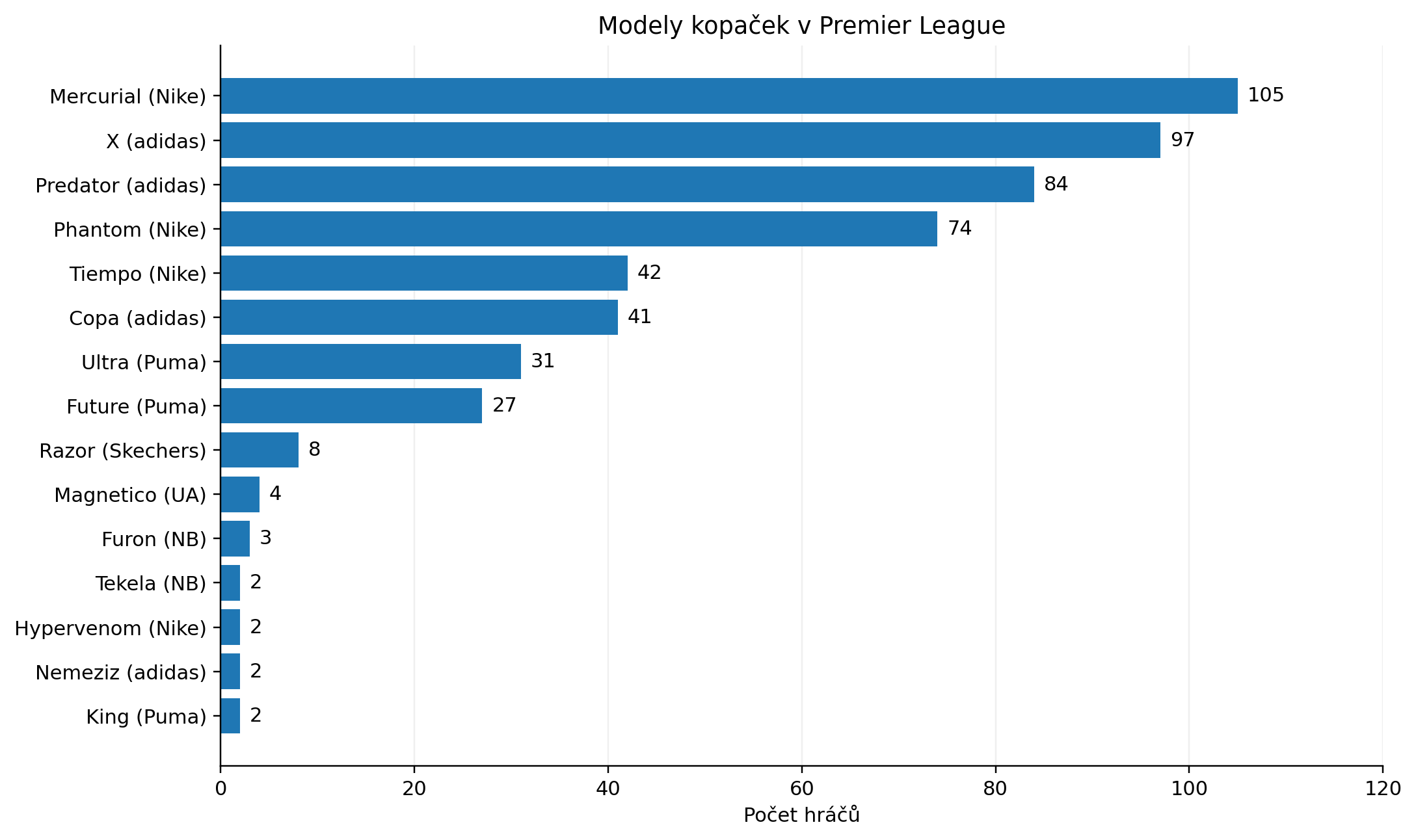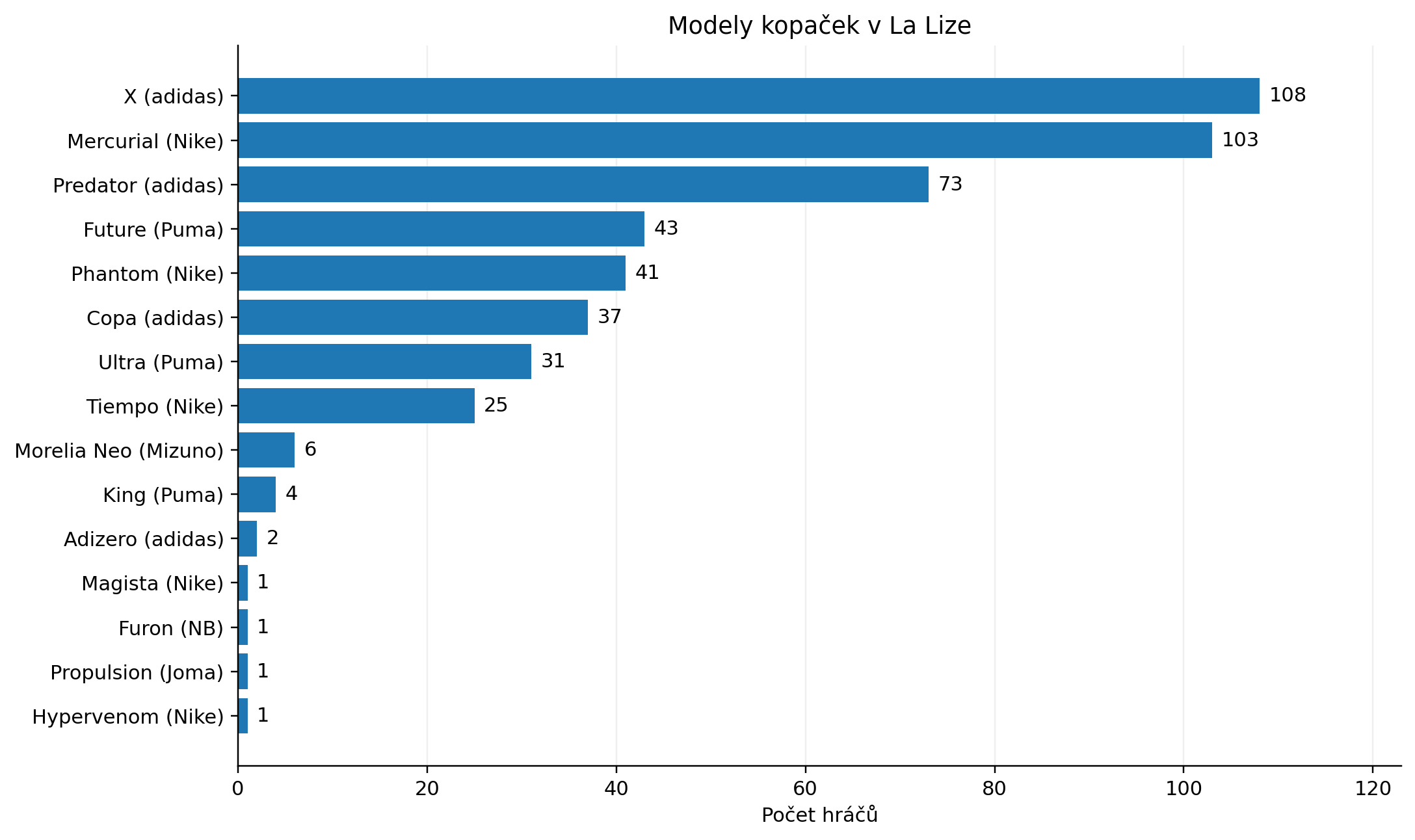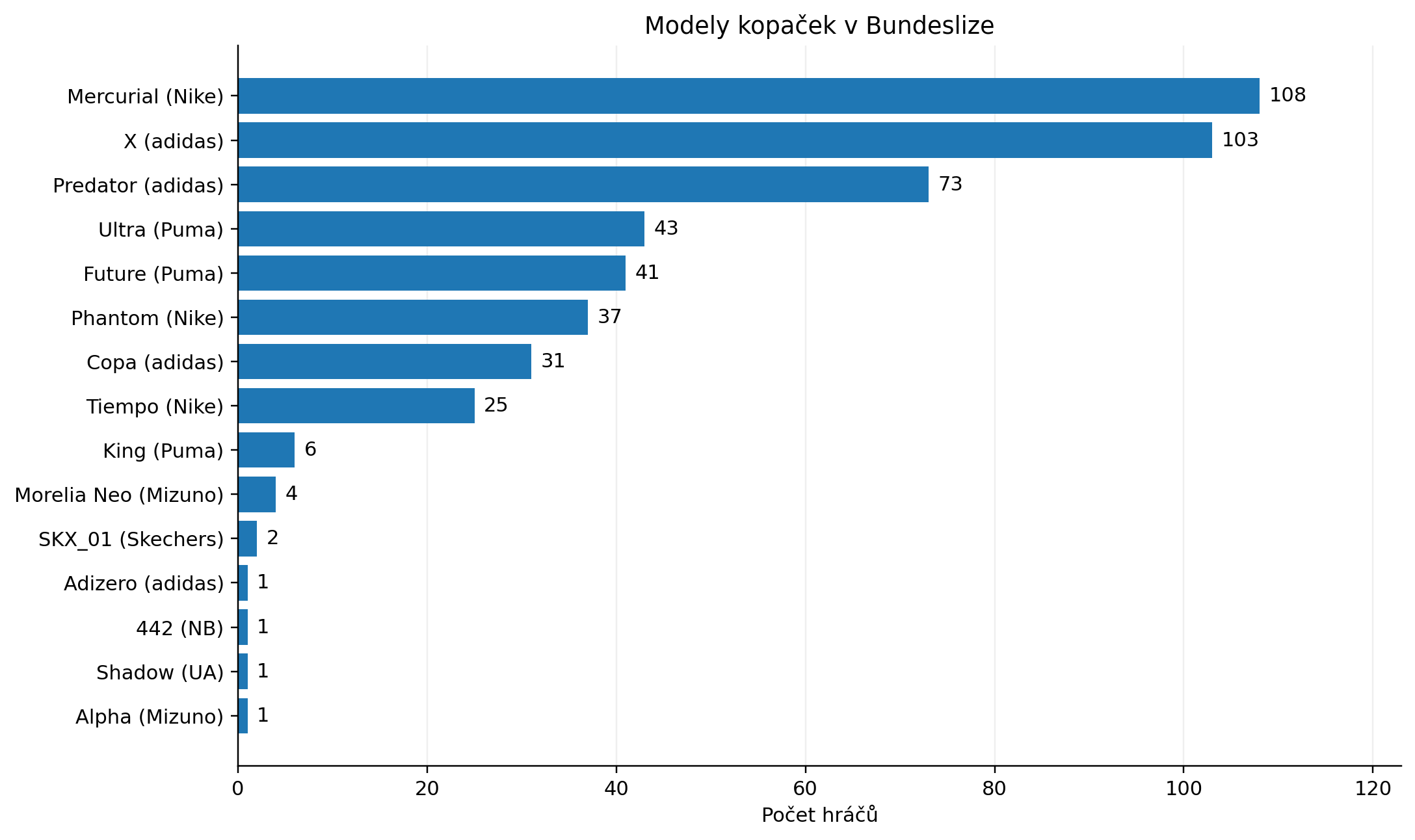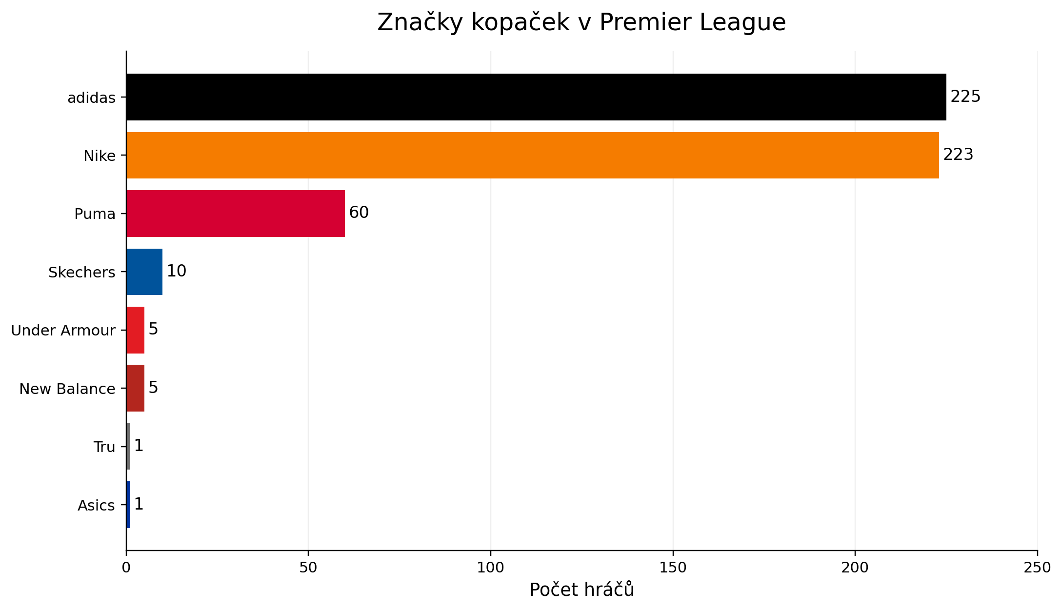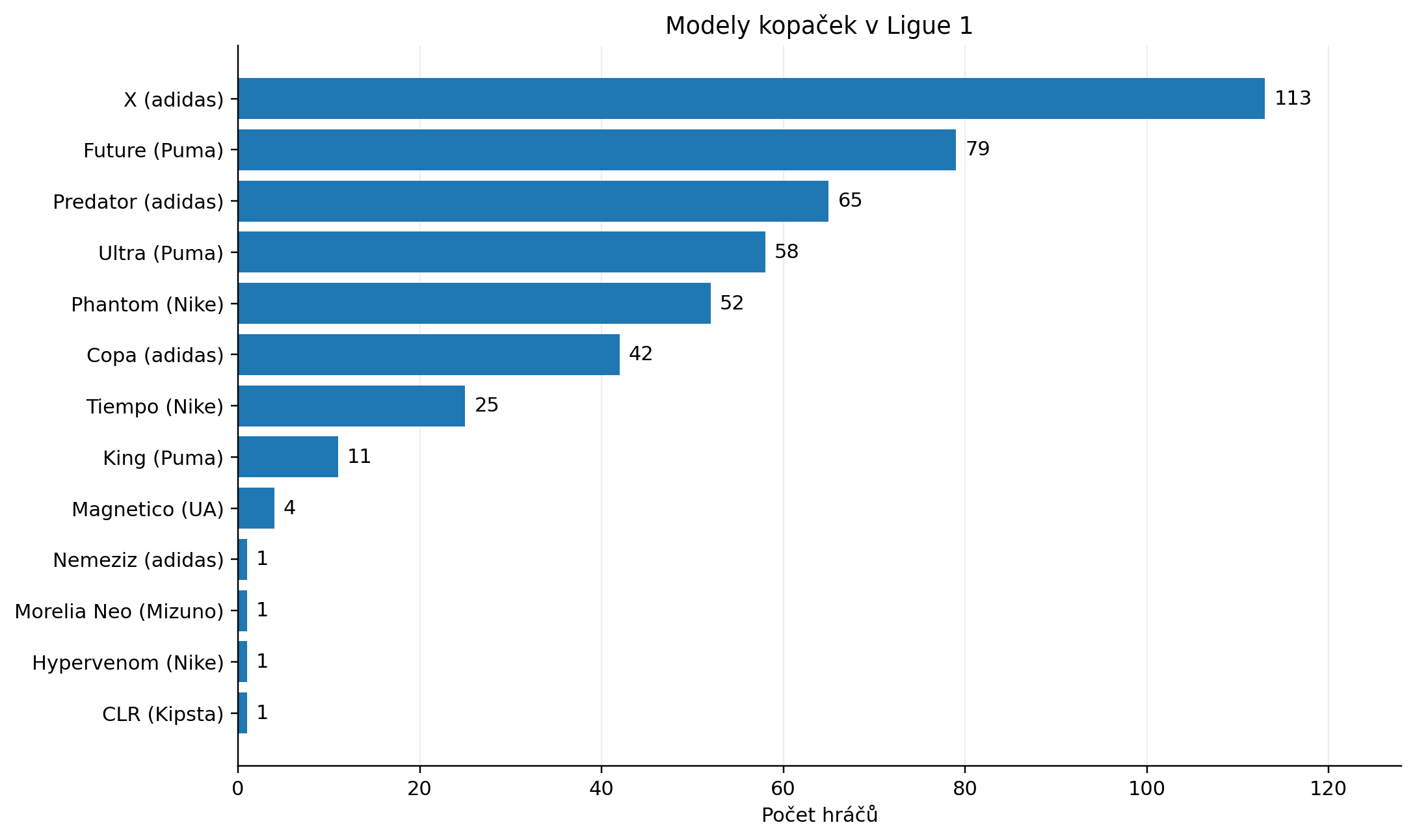 Sledoval jsem dvě věci. Značky kopaček a modely kopaček, které hráči v ligách nosí v aktuální sezóně 2023/2024. Tady jsou výsledky.