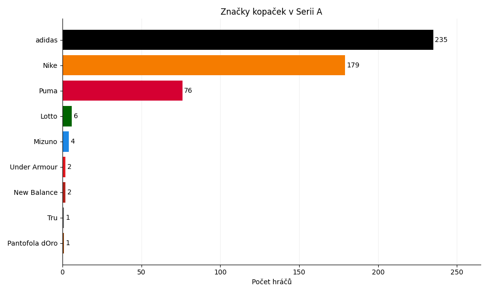 V italské sérii A má lehce dominantnější postavení adidas (46,4%), za ní opět Nike (35,4%) a Puma (15%). Vidět jsou ale i domácí italské značky Lotto a Pantofola dOro, které vyrábí jedny z nejkvalitnějších kožených kopaček na trhu.