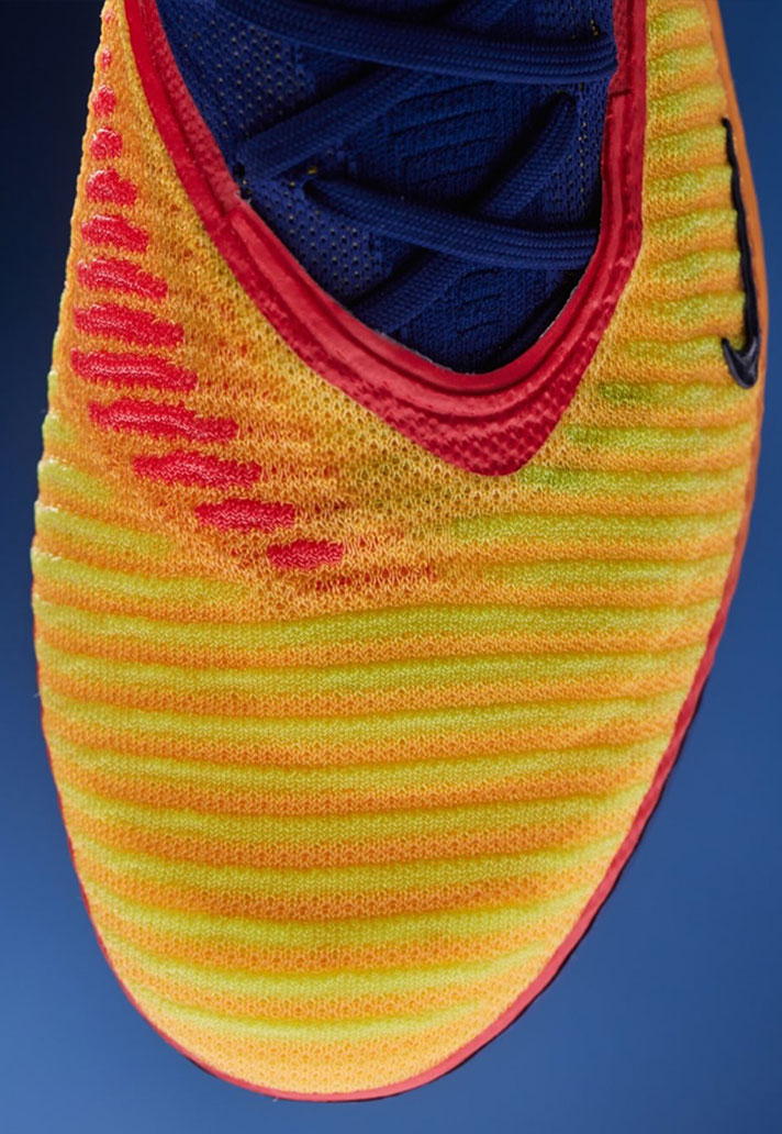 Svršek z materiálu Gripknit zdobí přechod žluté, oranžové a červené, zatímco na patě vyniká ohnivá grafika s obrácenou fajfkou a výraznými kolíky. Tmavě modré detaily pak doplňují celkový vzhled – od podrážky až po tkaničky – a vyvažují živé a divoké barvy.