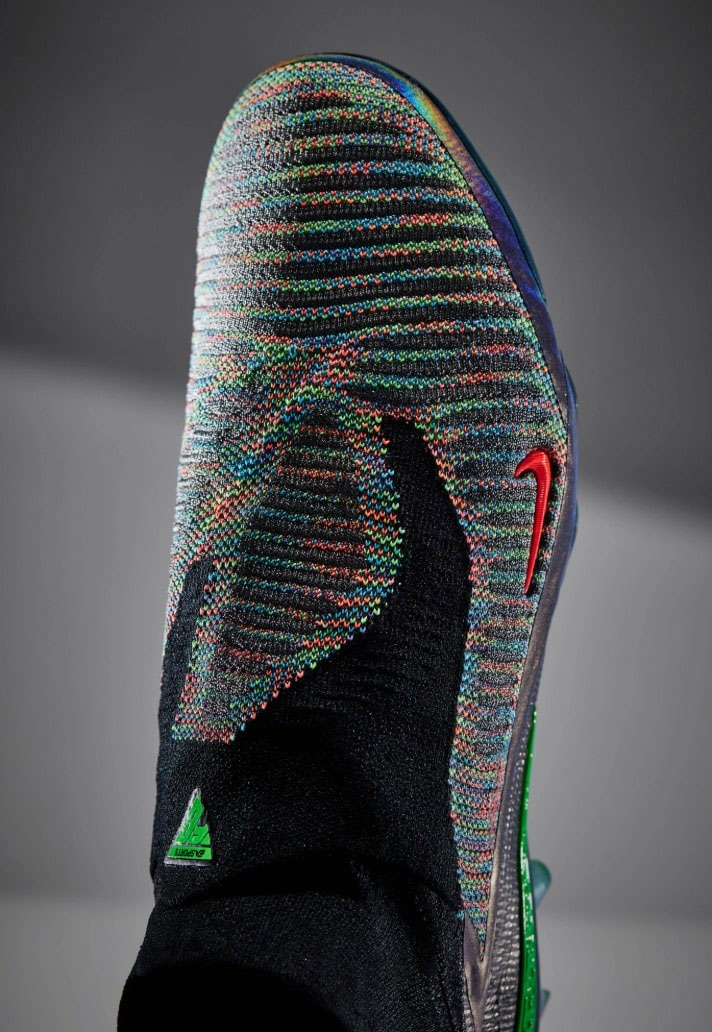 - Vysoký střih: černý pletený svršek s ponožkovým límcem, který přechází do holografické paty. V kontrastu svítí zelený obrácený Swoosh a červený detail na špičce.