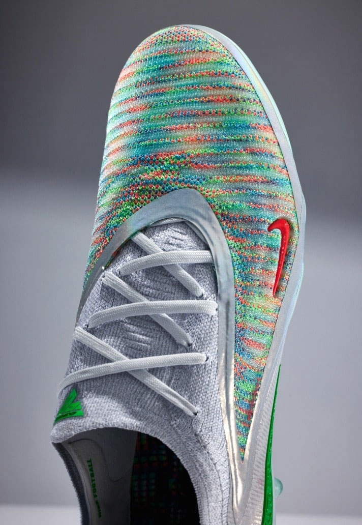- Nízký střih: čistě bílý svršek z pleteniny, oživený vícebarevnými vlákny, které vytvářejí efekt rozbitých pixelů. Nechybí neonově zelený Swoosh přes patu a malý červený detail na špičce.